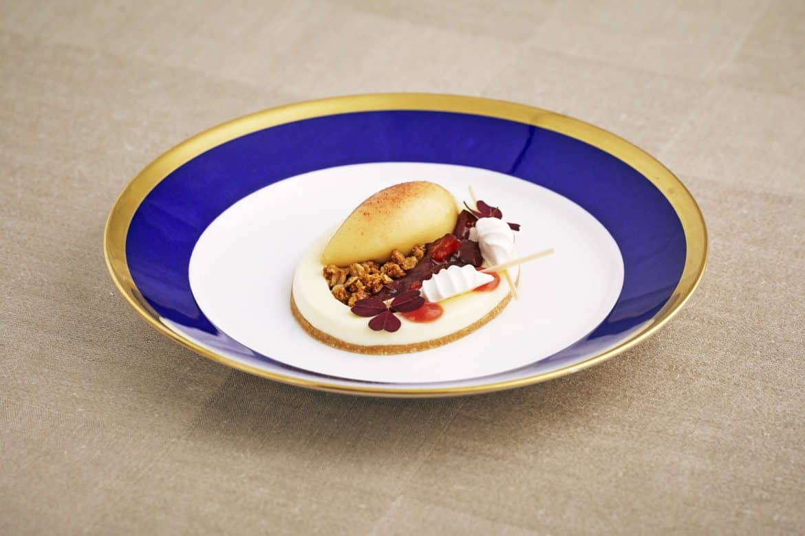 Bakad cheesecake och plommonkompott smaksatt med stjärnanis, plommonkräm, mirabellemaränger, havrekrisp samt mirabellesorbet smaksatt med ingefära.